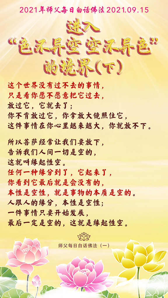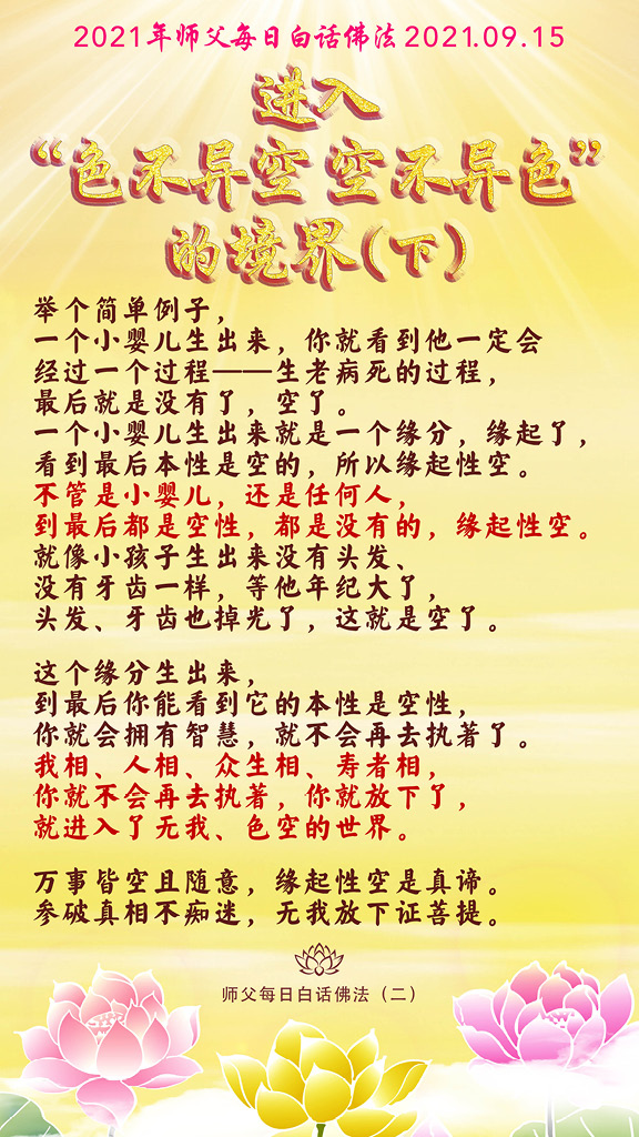 这个缘分生出来,到最后你能看到它的本性是空性,你就会拥有智慧,就不会再去执著了。我相、人相、众生相、寿者相,你就不会再去执著,你就放下了,就进入了无我、色空的世界。