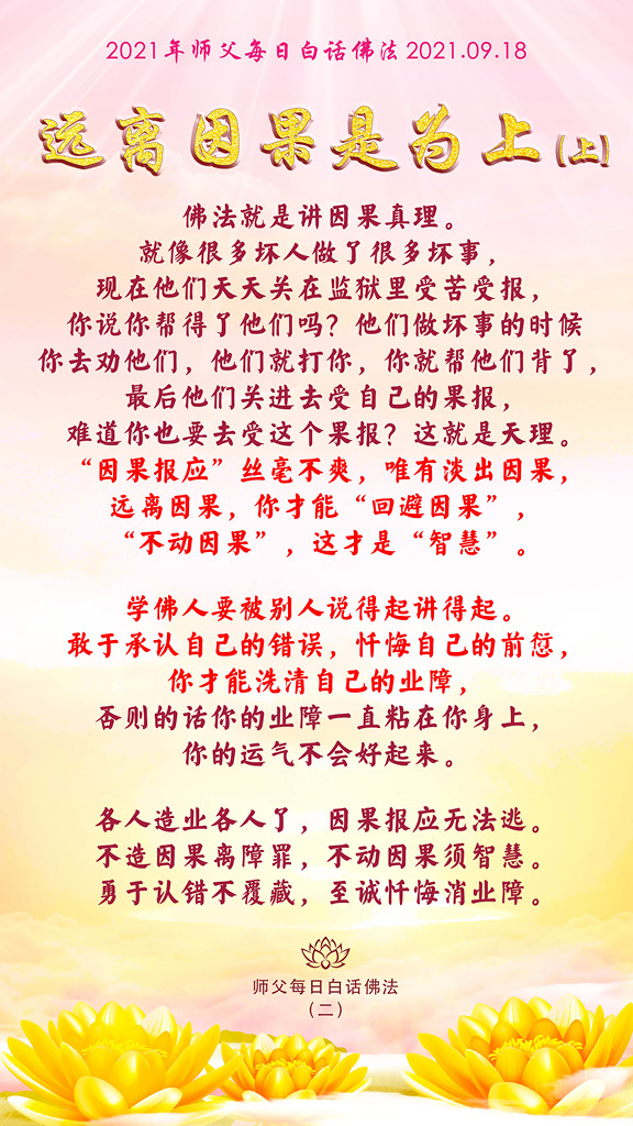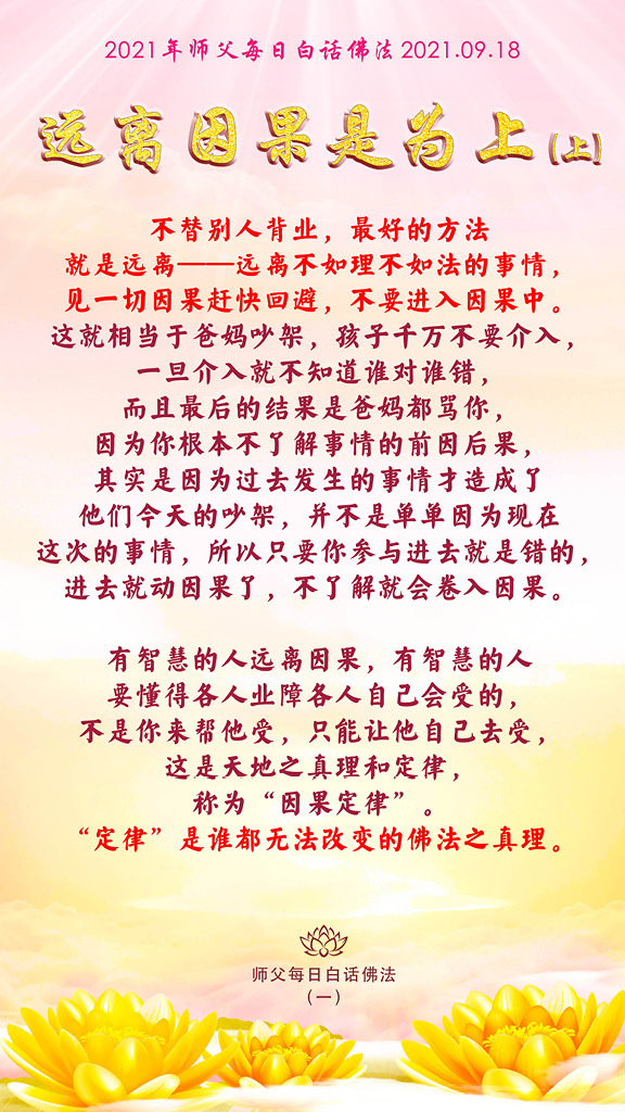 有智慧的人远离因果,有智慧的人要懂得各人业障各人自己会受的,不是你来帮他受,只能让他自己去受,这是天地之真理和定律,称为“因果定律”。“定律”是谁都无法改变的佛法之真理。