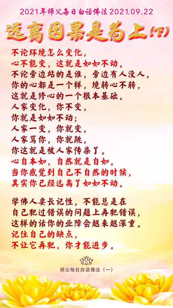 不论环境怎么变化,心不能变,这就是如如不动。不论旁边站的是谁,旁边有人没人,你的心都是一个样,境转心不转,这就是修心的一个根本基础。人家变化,你不变,你就是如如不动;人家一变,你就变,人家骂你,你就跳,你这就是被人家传染了。心自本如,自然就是自如。当你感觉到自己不自然的时候,其实你已经远离了如如不动。