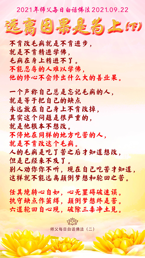 一个声称自己总是忘记毛病的人,就是等于把自己的缺点永远放在自己身上不肯改掉,其实这个问题是很严重的,就是他根本不想改。不停地在同样的地方吃苦的人,就是不肯改这个毛病。人的毛病是吃了苦之后才知道想改,但是已经来不及了。别人劝你你不听,现在自己吃苦才知道,这样就不能远离颠倒梦想和轮回之苦。