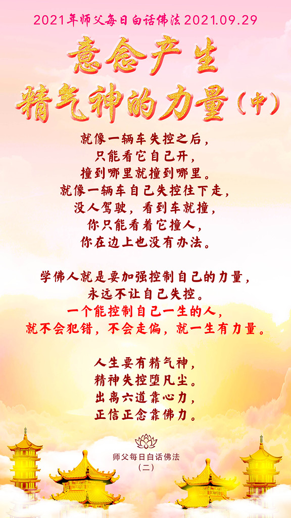 学佛人就是要加强控制自己的力量,永远不让自己失控。一个能控制自己一生的人,就不会犯错,不会走偏,就一生有力量。