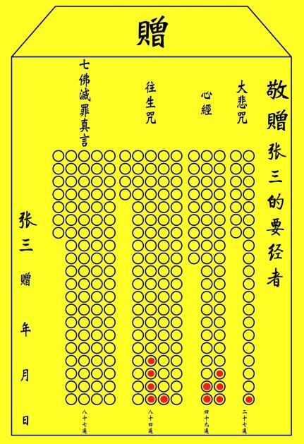- 每念完一遍经就用红笔在这部经相应的小圆圈内点一下,也可以念完多个或者全部念完后一起点。