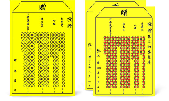 4. Each time you finish reciting a sutra or mantra, use a red pen to put a dot inside the circle corresponding to the one that you have just recited. You can also recite a number of sutras or mantras and then dot the circles all at once. Please note that you must use a red pen, and you must only put a red dot, not a tick or a cross. In addition, you must not put the dot before you finish reciting. The red dot should only be a small one; it should not fill up the entire circle. The number of times that you recite should not be less than the number required on the Little House, but it is alright to recite more than the required number.