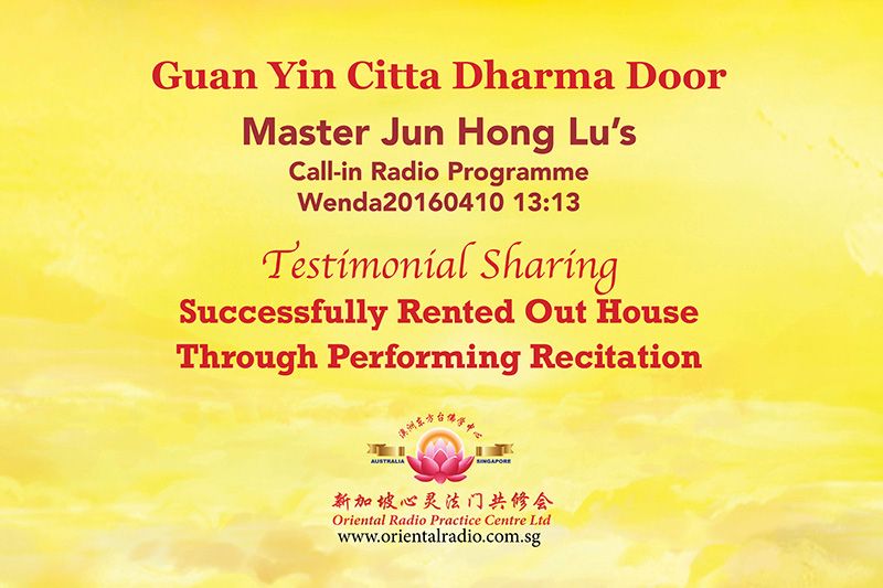 Through practising Buddhism and listening to Master Jun Hong Lu’s advice every week, we are taught to stay calm and composed no matter what happens. When faced with any difficulties, we were taught that we must focus on performing recitations and praying to Guan Yin Bodhisattva. This is what I did the entire time. Everyone in the family, including me, seemed to be calm and composed. My mother also helped out by reciting the Little House. Every day I prayed to Guan Yin Bodhisattva for helping us to find a tenant who would rent houses for exactly seven months. This would be a win-win situation—we won’t argue with each other over lack of income and it would also allow us to focus on reciting sutras/mantras. I then had a dream where there were many youngsters whom I do not know moving into my house. On the second day, just last week, I was fortunate to be able to get through to Master Jun Hong Lu’s radio program and I was advised to recite Little Houses as there were foreign spirits in my house. I told Master that my mother had already started reciting Little Houses. Miraculously, on Tuesday afternoon, my husband called and told me that we had managed to find a tenant. The rental commencement date starts exactly when the previous tenant left, not a day more, not a day less. This new tenant needed a place for seven months as they are renovating their house. The contract has now been signed.