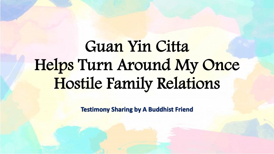Thank you for the opportunity to share with you my personal experience after practising Buddhism and how it turned around my once hostile family relationship to a harmonious one.