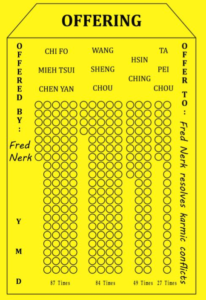 When the effects of reciting the Mantra to Untie Karmic Knots are not obvious in resolving your serious interpersonal conflicts, you may utilise Little Houses to resolve these conflicts. The recited Little House is to be addressed to “XXX resolves karmic conflicts”, XXX usually being your full name. Do not write the name of the other party. If you are not directly involved in the karmic conflicts, such as in the case of your parents’ negative karmic ties, XXX can be the name of either parent, but do not write the names of both parents on the Little House (refer to Figure 17).