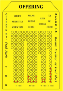 • Prior to putting a dot in the circles with a red pen, the reciter field of the Little House must be filled in. The recipient field should also be filled in, except in the case of Little Houses reserved for future use. If you fail to do so, the power from reciting sutras and mantras can be easily lost.