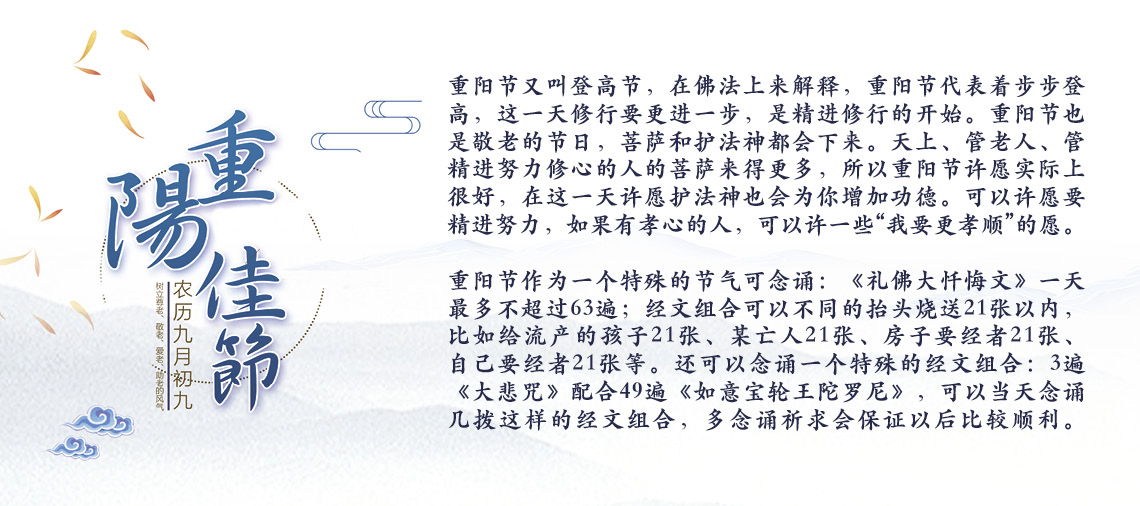 重阳节是我们中华民族一个非常大的传统节日,是尊重老人、弘扬中华传统文化的日子,也是佛法讲的慈悲精神传播日。
