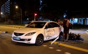 在这起车祸之后不到两个星期,12月17日我从修车厂取回车子第二天晚上,车子开到十字路口准备转弯时,我突然听到路人大声尖叫。紧接着车上玻璃碎片落满我全身,一辆电单车直冲上我左边车门,就在那一刻我看到一位女生从我车的左边飞落到车的右边。我当时真被这一幕吓呆了。我心中一面求观世音菩萨,一面下车查看:只看到一位男生满脸鲜血,眼睛突出,一动不动的直躺在地上,受伤的女生从另一处爬过来看男生的伤势。我吓得四肢发软,连手机都打不开。警察和救护车来后,我大脑一片空白,录了口供就回家等消息。我不知道警方会如何判定这次交通事故,但是在新加坡交通法律都是偏向行人,一旦判定我是责任方,我将会面临巨额的赔款,甚至刑事责任。