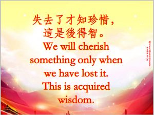 Words of Wisdom | Acquired Wisdom Published on October 22, 2020 We will cherish something only when we have lost it. This is acquired wisdom. 失去了才知珍惜,这是后得智。 – Master Jun Hong Lu, Words of Wisdom Volume 8