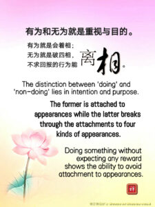 The distinction between ‘doing’ and ‘non-doing’ lies in intention and purpose. The former is attached to appearances while the latter breaks through the attachments to four kinds of appearances. Doing something without expecting any reward shows the ability to avoid attachment to appearances.