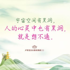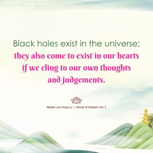Words of Wisdom | Black Holes of our Hearts Published on October 11, 2020 Black holes exist in the universe; they also come to exist in our hearts if we cling to our own thoughts and judgements. 宇宙空间有黑洞,人的心灵中也有黑洞,就是想不通。 – Master Jun Hong Lu, Words of Wisdom Volume 2
