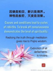 Causes and conditions lead to cycles of rebirths. To break off consciousness demonstrates the level of spirituality. Realising the truth through meditation gives rise to Prajna wisdom. Extinction of all defilements is nirvana.