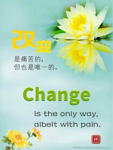 Words of Wisdom | Change Is The Only Way Published on October 12, 2020 Change is the only way albeit with pain. 改变是痛苦的, 但也是唯一的。 – Master Jun Hong Lu, Words of Wisdom Volume 8
