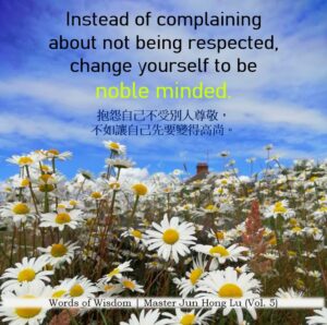 Words of Wisdom Words of Wisdom | Change To Be Noble-Minded 13/11/2020 | Words of Wisdom Words of Wisdom < Words of Wisdom Instead of complaining about not being respected, change yourself to be noble-minded. 抱怨自己不受别人尊敬, 不如让自己先要变得高尚。 – Master Jun Hong Lu, Words of Wisdom Volume 5 < Words of Wisdom