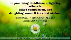 Words of Wisdom | Compassion and Wisdom Published on November 12, 2020 In practising Buddhism, delighting others is called compassion, and delighting yourself is called wisdom. 我们学佛做人,让别人快乐,那是慈悲;让自己快乐,那叫智慧。 – Master Jun Hong Lu, Words of Wisdom Volume 5