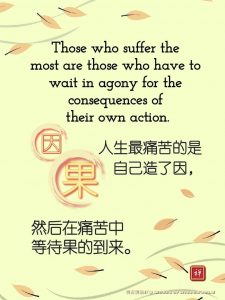 Words of Wisdom | Consequences Of One’s Own Action Published on October 28, 2020 Those who suffer the most are those who have to wait in agony for the consequences of their own action. 人生最痛苦的是自己造了因, 然后在痛苦中等待果的到来。 – Master Jun Hong Lu, Words of Wisdom Volume 8