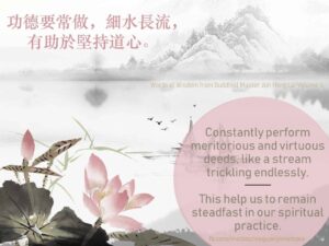 Constantly perform meritorious and virtuous deeds, like a stream trickling endlessly. This helps us to remain steadfast in our faith in spiritual practice.
