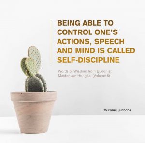 Words of Wisdom Words of Wisdom | Control one’s actions, speech and mind 01/11/2020 | Words of Wisdom Words of Wisdom < Words of Wisdom Being able to control one’s actions, speech and mind is called self-discipline. 自己能管住自己的身口意,就叫自律。 – Master Jun Hong Lu, Words of Wisdom Volume 6 < Words of Wisdom