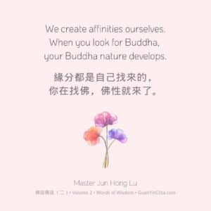 Words of Wisdom | Create Your Affinities Published on October 12, 2020 We create affinities ourselves. When you look for Buddha, your Buddha nature develops. 缘分都是自己找来的,你在找佛,佛性就来了。 – Master Jun Hong Lu, Words of Wisdom Volume 2