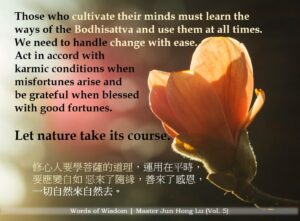 Those who cultivate their minds must learn the ways of the Bodhisattva and use them at all times. We need to handle change with ease. Act in accord with karmic conditions when misfortunes arise and be grateful when blessed with good fortunes. Let nature take its course.