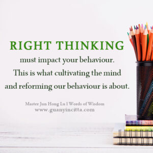 Words of Wisdom Words of Wisdom | Cultivating And Reforming 14/02/2021 | Words of Wisdom Words of Wisdom < Words of Wisdom Right thinking must impact your behaviour. This is what cultivating the mind and reforming our behaviour is about. 正思维必须影响你的行为, 这才是修心修行。 Master Jun Hong Lu, Words of Wisdom Volume 9 < Words of Wisdom