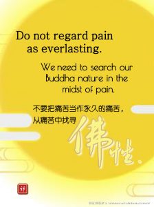 Words of Wisdom | Do Not Regard Pain As Everlasting Published on October 28, 2020 Do not regard pain as everlasting. We need to search our Buddha nature in the midst of pain. 不要把痛苦当作永久的痛苦,从痛苦中找寻佛性。 – Master Jun Hong Lu, Words of Wisdom Volume 8