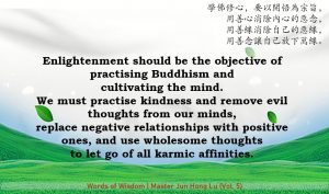 Enlightenment should be the objective of practising Buddhism and cultivating the mind. We must practise kindness and remove evil thoughts from our minds, replace negative relationships with positive ones, and use wholesome thoughts to let go of all karmic affinities.