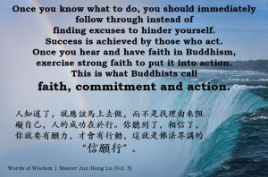 Once you know what to do, you should immediately follow through instead of finding excuses to hinder yourself. Success is achieved by those who act. Once you hear and have faith in Buddhism, exercise strong faith to put it into action. This is what Buddhists call ‘faith, commitment and action’.