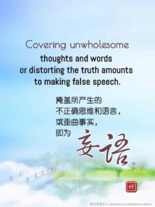 Words of Wisdom | False Speech Published on October 21, 2020 Covering unwholesome thoughts and words or distorting the truth amounts to making false speech. 掩盖所产生的不正确思维和语言,或歪曲事实,即为妄语。 – Master Jun Hong Lu, Words of Wisdom Volume 8