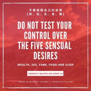 Words of Wisdom | Five Sensual Desires Published on October 21, 2020 Do not test your control over the five sensual desires – Wealth, Sex, Fame, Food and Sleep. 不要挑战自己的底限(财、色、名、食、睡)。 – Master Jun Hong Lu, Words of Wisdom Volume 2