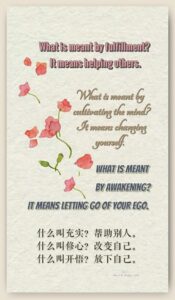 What is meant by fulfillment? It means helping others. What is meant by cultivating the mind? It means changing yourself. What is meant by awakening? It means letting go of your ego.