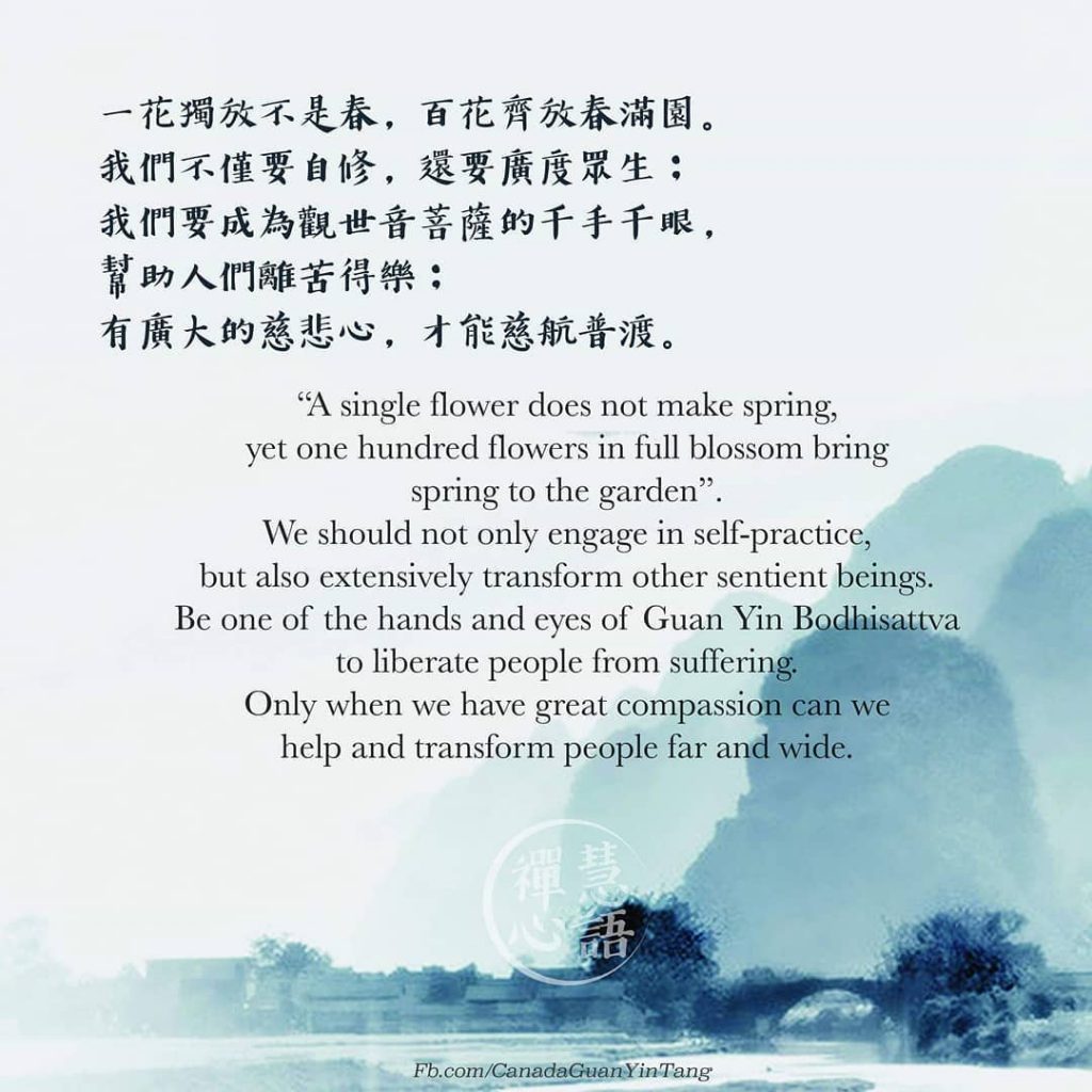 一花独放不是春,百花齐放春满园。我们不仅要自修,还要广度众生; 我们要成为观世音菩萨的千手千眼, 帮助人们离苦得乐; 有广大的慈悲心,才能慈航普度。