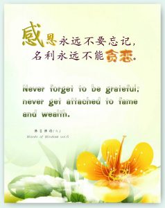 Words of Wisdom | Gratitude Published on September 8, 2020 Never forget to be grateful; never get attached to fame and wealth. 感恩永远不要忘记, 名利永远不能贪恋。 – Master Jun Hong Lu, Words of Wisdom Volume 6