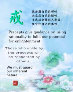 Precepts give guidance on using rationality to fulfil our potential for enlightenment. Those who abide by the precepts will be respected by others. We must guard our inherent nature.