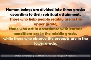 Human beings are divided into three grades according to their spiritual attainment. Those who help people readily are in the upper grade; those who act in accordance with karmic conditions are in the middle grade, while those who observe the precepts are in the lower grade.
