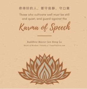 Words of Wisdom | Karma Of Speech Published on October 30, 2020 Those who cultivate well must be still and quiet, and guard against the karma of speech. 修得好的人,要守寂静,守口业。 Master Jun Hong Lu, Words of Wisdom Volume 4