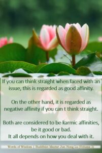 If you can think straight when faced with an issue, this is regarded as good affinity. On the other hand, it is regarded as negative affinity if you can’t think straight. Both are considered to be karmic affinities, be it good or bad. It all depends on how you deal with it.