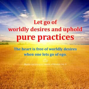 Words of Wisdom | Let Go Of Worldly Desires Published on February 14, 2021 Let go of worldly desires and uphold pure practices. The heart is free of worldly desires when one lets go of ego. 离欲梵行,放下人间无罣礙, 心中无我欲望空! Master Jun Hong Lu, Words of Wisdom Volume 9