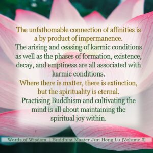 The unfathomable connection of affinities is a by-product of impermanence. The arising and ceasing of karmic conditions as well as the phases of formation, existence, decay, and emptiness are all associated with karmic conditions. Where there is matter, there is extinction, but the spirituality is eternal. Practising Buddhism and cultivating the mind is all about maintaining the spiritual joy within.