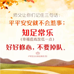 师父让你们记住三句话: 平平安安就不会惹事; 知足常乐(幸福底线放低一点); 好好修心,不要掉队。