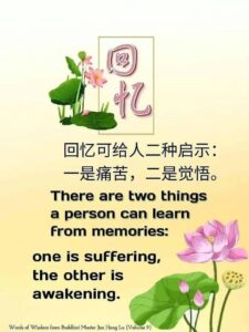 Words of Wisdom | Memories: Suffering And Awakening Published on February 23, 2021 There are two things a person can learn from memories: one is suffering, the other is awakening. 回忆可给人二种启示: 一是痛苦,二是觉悟。 Master Jun Hong Lu, Words of Wisdom Volume 9