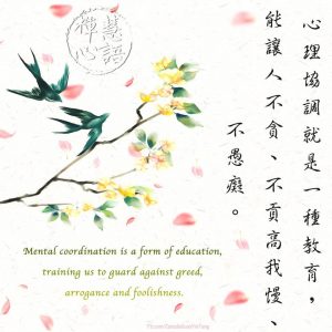Words of Wisdom Words of Wisdom | Mental Coordination 27/10/2020 | Words of Wisdom Words of Wisdom < Words of Wisdom Mental coordination is a form of education, training us to guard against greed, arrogance and foolishness. 心理协调就是一种教育, 能让人不贪、不贡高我慢、不愚痴。 Master Jun Hong Lu, Words of Wisdom Volume 4 < Words of Wisdom