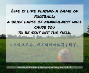Words of Wisdom Words of Wisdom | Mindfulness 13/11/2020 | Words of Wisdom Words of Wisdom < Words of Wisdom Life is like playing a game of football; a brief lapse of mindfulness will cause you to be sent off the field. 人生像玩足球,稍不留神就被罚下场了。 – Master Jun Hong Lu, Words of Wisdom Volume 5 < Words of Wisdom