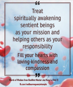 Treat spiritually awakening sentient beings as your mission and helping others as your responsibility. Fill your hearts with loving-kindness and compassion.