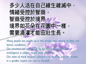 Many people are caught up in the arising and ceasing of their own karmic conditions. Our emotions are controlled by our intelligence, and our intelligence is subject to our state of mind. Our state of mind requires cultivation to develop, just like flowers in a garden require our care to flourish.