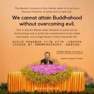 The Master’s mission in this human realm is to act as a Dharma Protector at times and to fight evil. We cannot attain Buddhahood without overcoming evil. This is why the Master never hesitates to point out our shortcomings and to purify the contamination in our minds and bodies, not a single shred of which should be left.
