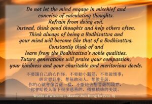 Do not let the mind engage in mischief and conceive of calculating thoughts. Refrain from doing evil. Instead, think good thoughts and help others often. Think always of being a Bodhisattva and your mind will become like that of a Bodhisattva. Constantly think of and learn from the Bodhisattva’s noble qualities. Future generations will praise your compassion, your kindness and your charitable and meritorious deeds.