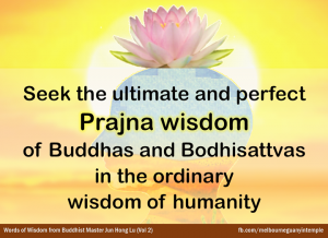 Words of Wisdom | Prajna Wisdom Published on October 11, 2020 Seek the ultimate and perfect Prajna wisdom of Buddhas and Bodhisattvas in the ordinary wisdom of humanity. 在人间智慧中,寻找佛菩萨的般若。 – Master Jun Hong Lu, Words of Wisdom Volume 2