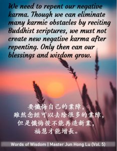 We need to repent our negative karma. Though we can eliminate many karmic obstacles by reciting Buddhist scriptures, we must not create new negative karma after repenting. Only then can our blessings and wisdom grow.